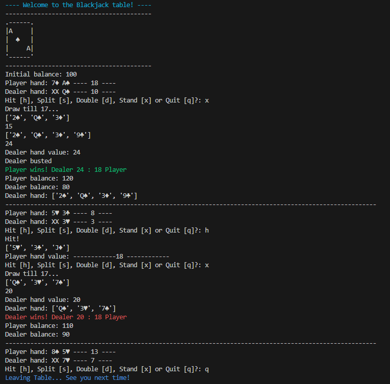 Simple blackjack game written in Python. To run the game run the command "python -m pip install -r requirements.txt". After the requirements are installed, run "python blackjack.py".