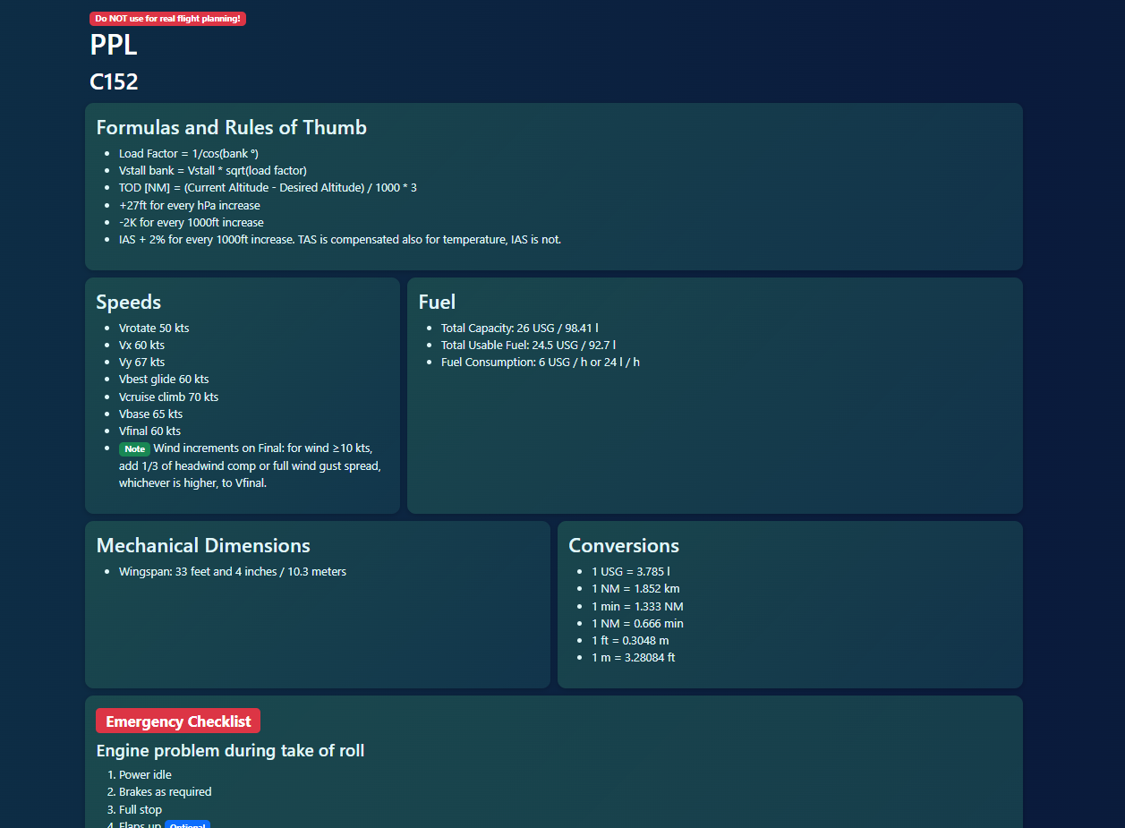 This page is a collection of useful information gathered on one page which I can be use during my PPL.