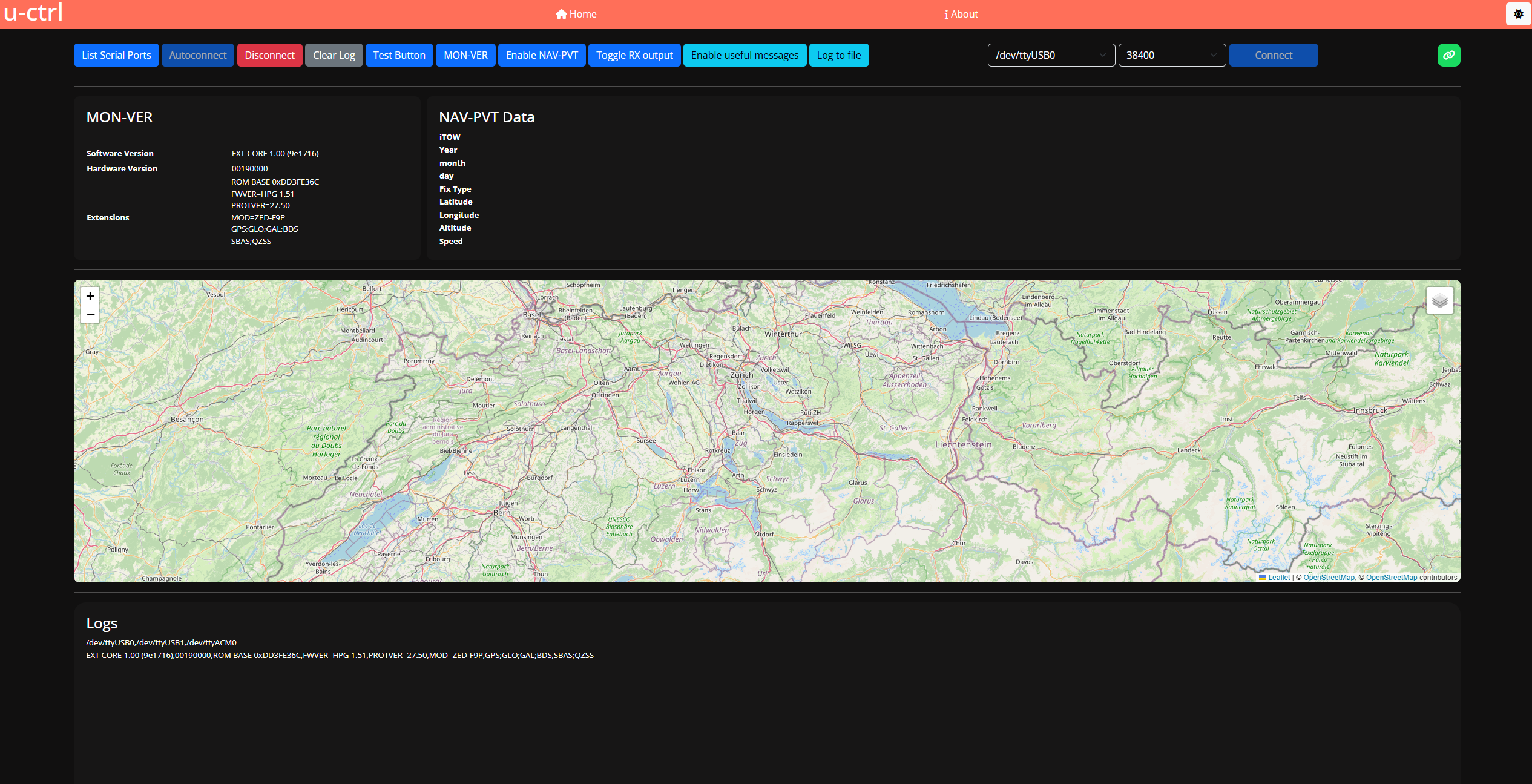 With this application it is possible to connect (automatically or manually) to a u-blox GNSS receiver. There is the option to enable the NAV-PVT message in case it is not enabled by default. The NAV-PVT message needs to be enabled to show the position on the map. More features planned, WIP 🚧!